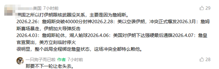 上午带着颓废更完小号后,评论区有人煞有其事的罗列“美伊战争其实与伊核问题无关,主要就是因为詹姆斯”,看得人一愣一愣的,当然老哥列数据应该列错了(例如40000分应为43000分),但大致时间线像是那么回事。再转念一想,NBA赛场现在这局面不也是老头的问题嘛,谁让这41岁的中登近几场把把C这么来劲化身雷霸龙的?他要稍微颓一点,世界线不就回归预期了嘛。